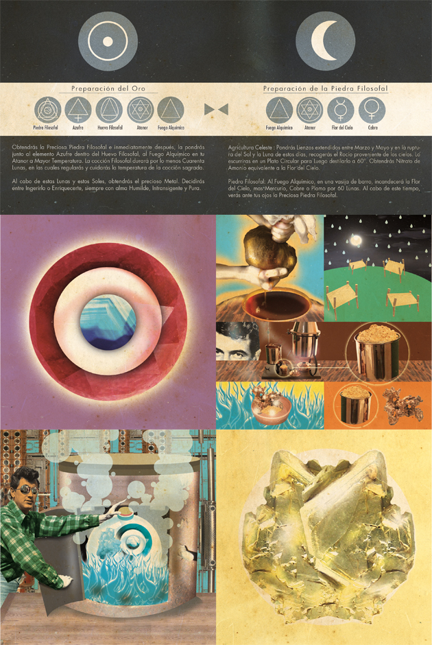 This is an academic project i just made: I represented an instructional manual to learn how to make gold, based only on the several old processes of The Alchemy, and the Philosopher's stone. Was a very long work, because it's not easy to understand ancient documents. Alchemist used very difficult codes with key words and metaphorical language, including symbols as well, in order to make this kind of processes unkown and mysterious. Well, after all the reading stuff, i had to decide wich style i was gonna use. Then, i based the design line and Illustrations on 50's to 70's Ads, and Voilà!
